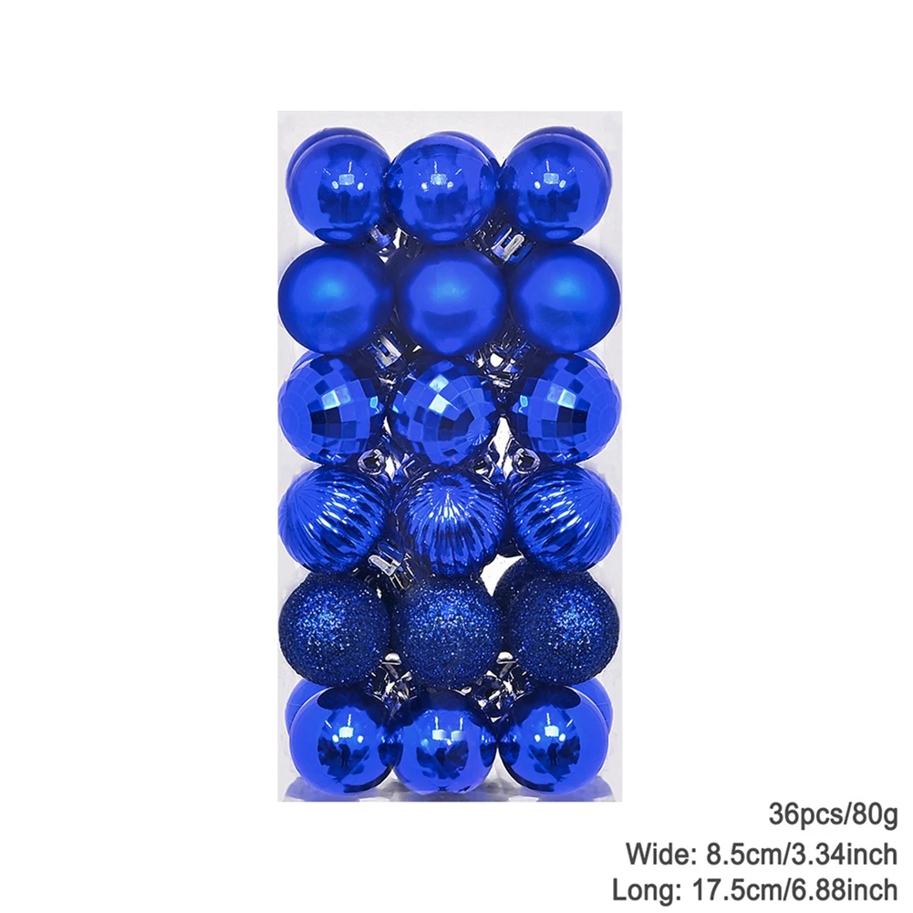 Zestaw 36 brokatowych, ocynkowanych bombek choinkowych w 5 różnych stylach. Każda bombka ma średnicę 3 cm